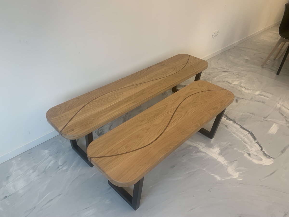 Handgemaakte gebogen binnenbank met notelaar accent en gelaste metalen poten. Een uniek meubelstuk dat comfort en design combineert.